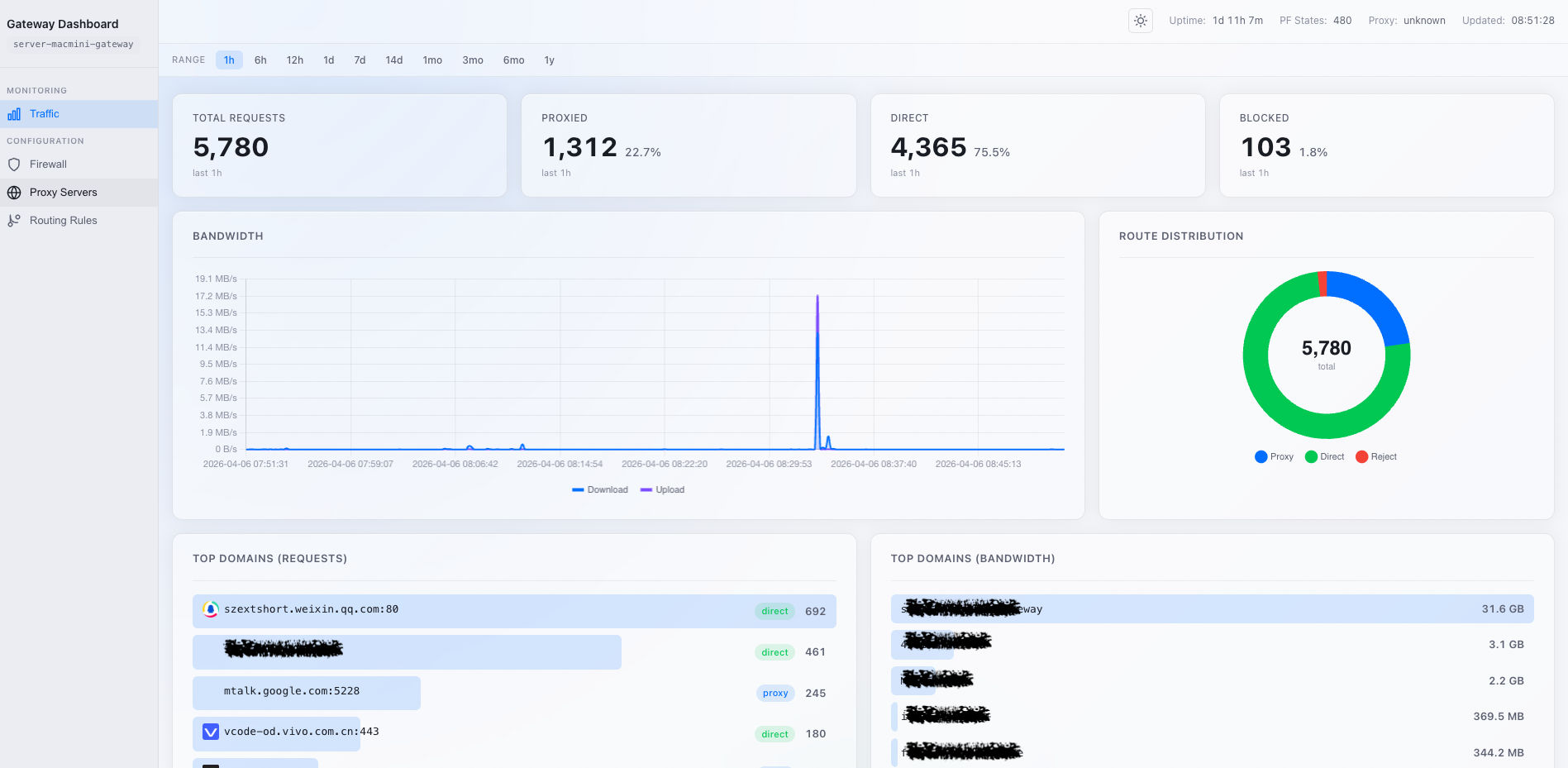 我没怎么花时间纠结 BSD 的选择,很快就下载了社区更活跃的 FreeBSD,并把它安装到了这台老 Mac mini 上。作为流量网关,这件事在思路上和 Linux 其实是一致的:都是由防火墙先负责重定向流量,再把流量交给分流服务,由后者根据域名或 IP 策略把请求导向不同出口。真正的区别在于防火墙和网络配置的方式,FreeBSD 使用了 pf,也正是在这里,我第一次觉得事情重新变得顺手了。pf 的规则简单、清楚,而且符合直觉。更重要的是,它写出来是什么样,运行起来大体也就是什么样。换句话说,pf 配置文件能够比较准确地表达我的需求,而不是像之前那样,要在一堆复杂规则里反复猜到底是哪一环出了问题。那种熟悉的工程直觉终于回来了:配置文件不再像某种需要反复试探的仪式,而更像是一份可以被信任的说明书。